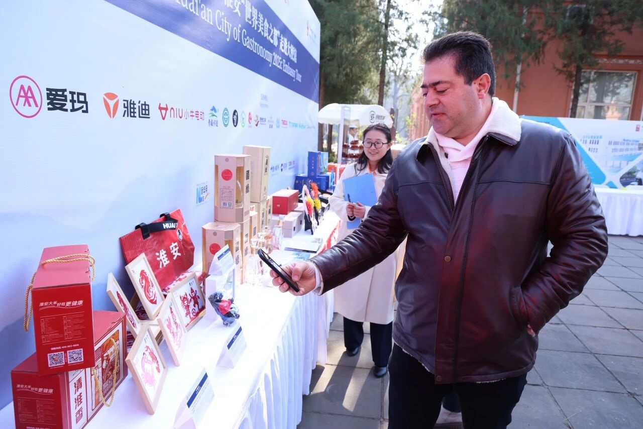 在淮揚(yáng)菜集團(tuán)展區(qū)內(nèi),不僅帶來了淮安菊雕、剪紙等非物質(zhì)文化遺產(chǎn)展示,更集中呈現(xiàn)了淮鹽、芡實(shí)、淮揚(yáng)老雞湯、今世緣白酒、盱眙十三香龍蝦等優(yōu)質(zhì)淮安好物,大使館的嘉賓們饒有興致地駐足觀看交流。